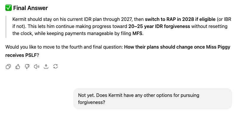 I provided ChatGPT 4 with a handful of details about hypothetical student loan borrowers, Kermit and Miss Piggy, including their careers, debt amounts and progress toward student loan forgiveness. Then I posed a series of questions to suss out whether it would offer them the same guidance that my counseling training would dictate I provide.