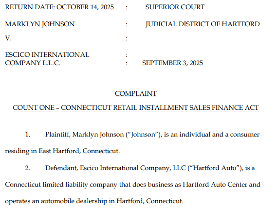 Turns out, according to Johnson’s legal complaint in Hartford’s superior court, the used car dealership that sold her the vehicle two months earlier had decided to repossess it at that very inopportune time — even though she hadn’t missed a single payment.